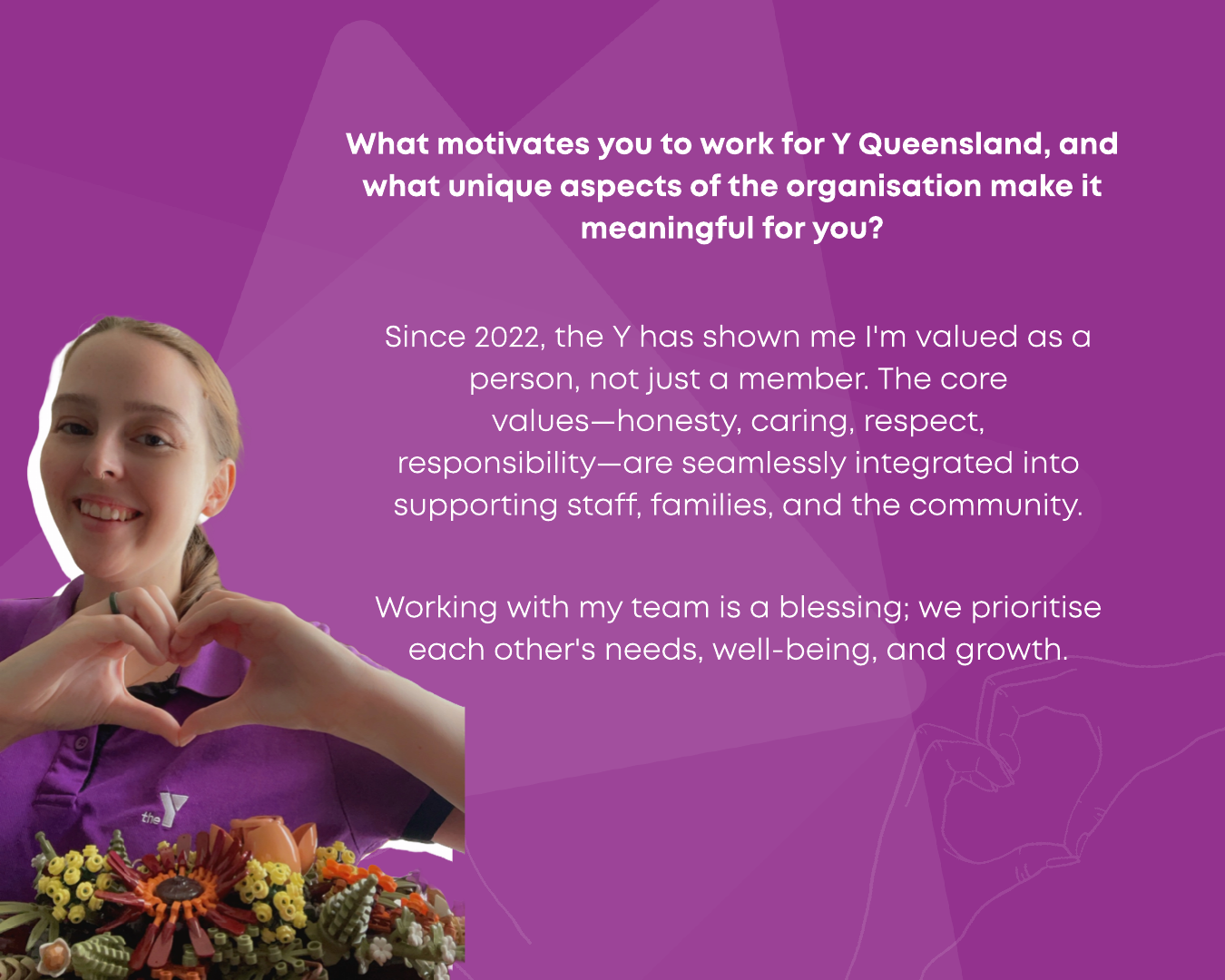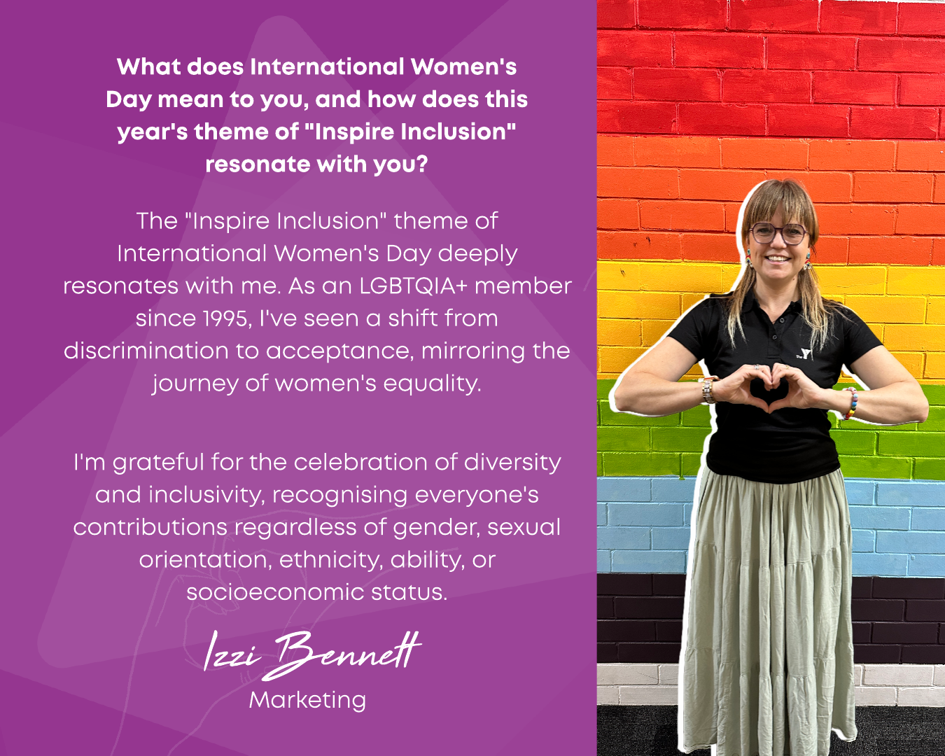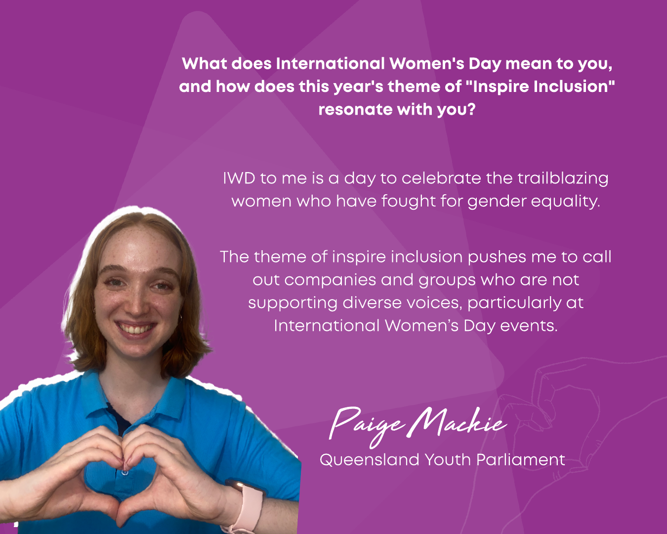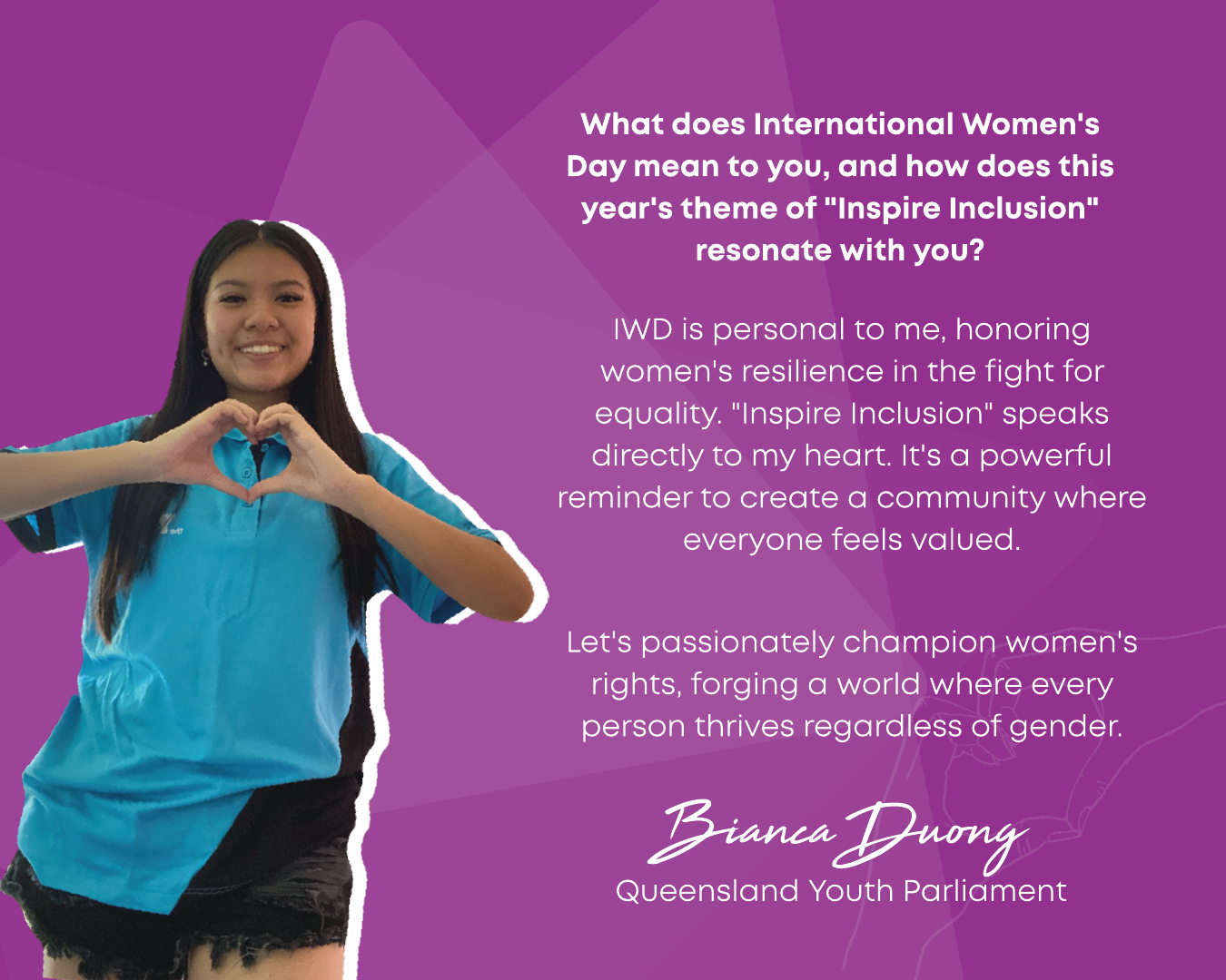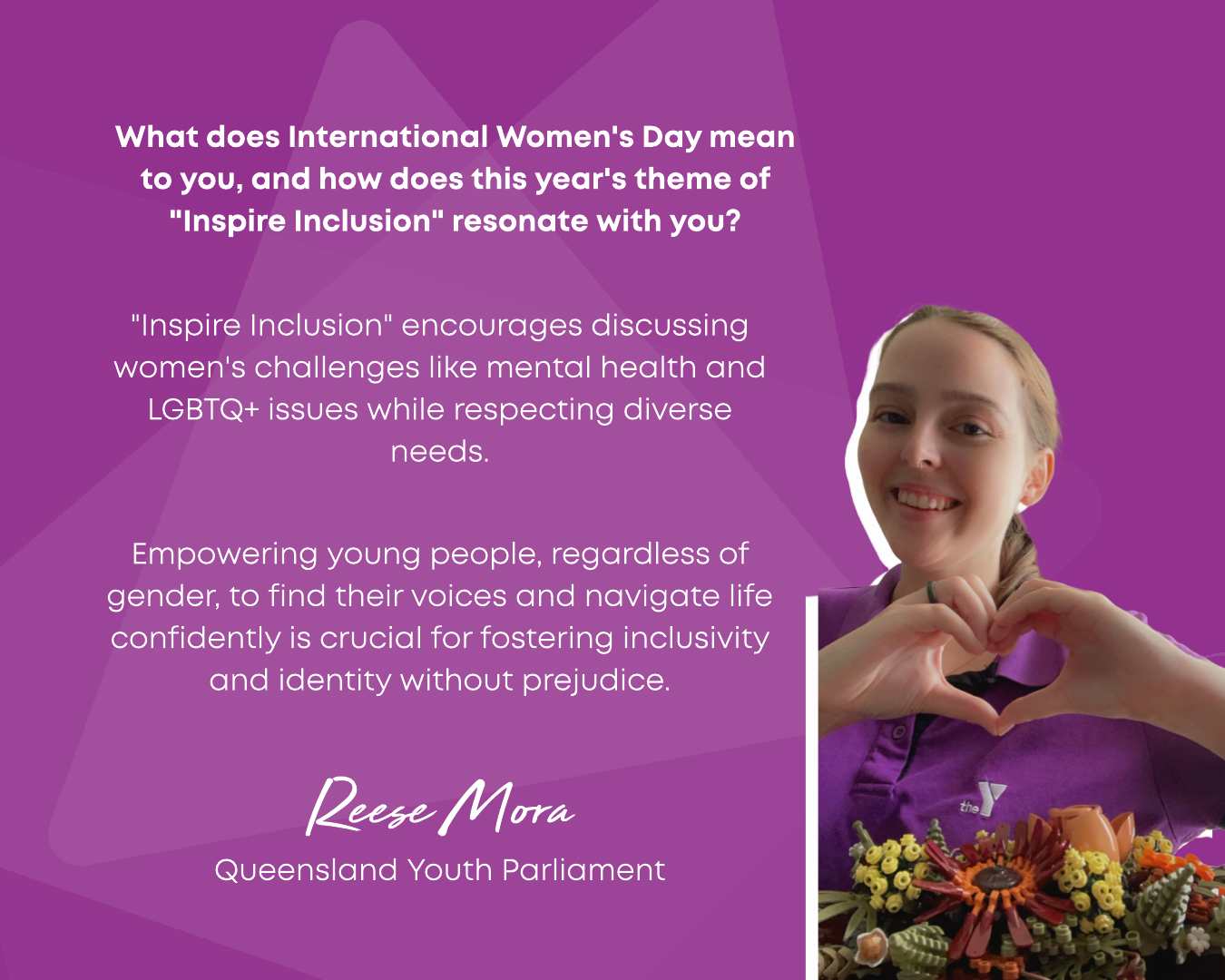 In 2024, Y Queensland celebrated IWD with the theme Inspire Inclusion, encouraging diversity, empowerment, and breaking barriers. As part of this, we launched Women & Their Y—a campaign inviting employees and volunteers to share their thoughts on what the theme meant to them. Their reflections highlighted the importance of fostering environments where all women—regardless of background, ability, or identity—are valued and supported.