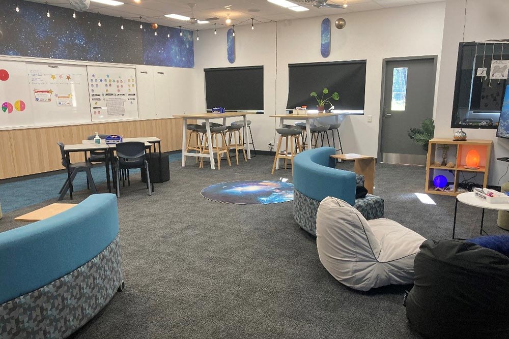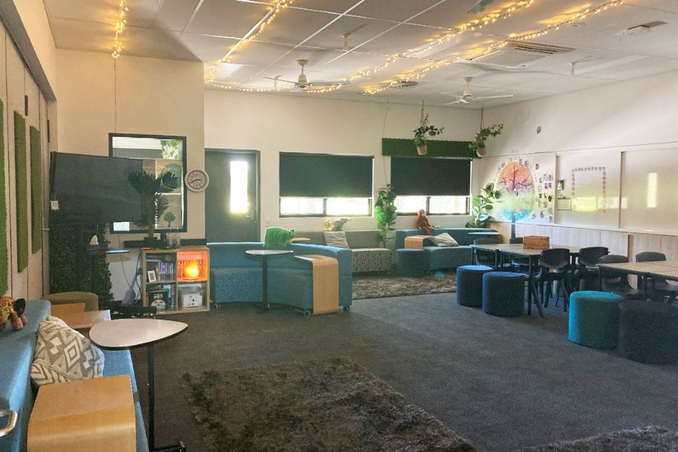 Learning Area 2 is a warm 65m2 room featuring various soft seating, tables, chairs, whiteboards and a smart TV, with HDMI cabling for computer connection. This space is suitable for a meeting, group activity or recreation area for approximately 20 people. It is possible at request, for concertina walls to be removed and include the hire of Learning Area 1 (70m2) which would double the space, at an additional cost.